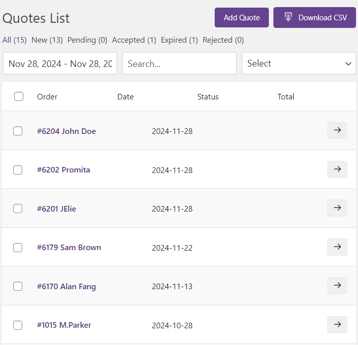 Manage all quotes, view their status, and take action from the quotation list page.
